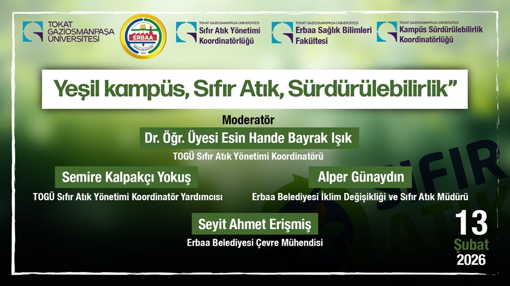YÖK’ün 2030 Vizyon Belgesi’nde öncelikli alanlar olarak belirlediği sürdürülebilirlik, sıfır atık, iklim değişikliğiyle mücadele ve yeşil kampüs uygulamaları doğrultusunda, Üniversitemiz Erbaa Sağlık Bilimleri Fakültesi ile Erbaa Kaymakamlığı, Erbaa Belediyesi, Erbaa İlçe Sağlık Müdürlüğü ve Erbaa İlçe Millî Eğitim Müdürlüğü arasında imzalanan “Sürdürülebilirlik ve Yeşil Dönüşüm İş Birliği Protokolü” çerçevesinde “Yeşil Kampüs, Sıfır Atık, Sürdürülebilirlik” temalı panel düzenlendi.